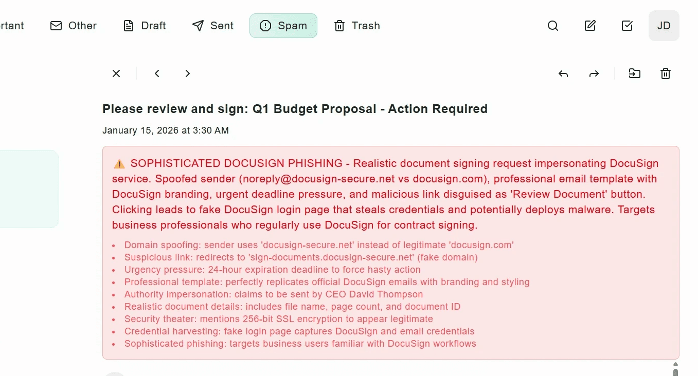 Real-time analysis catches phishing, fake invoices, and scams that slip past traditional filters.