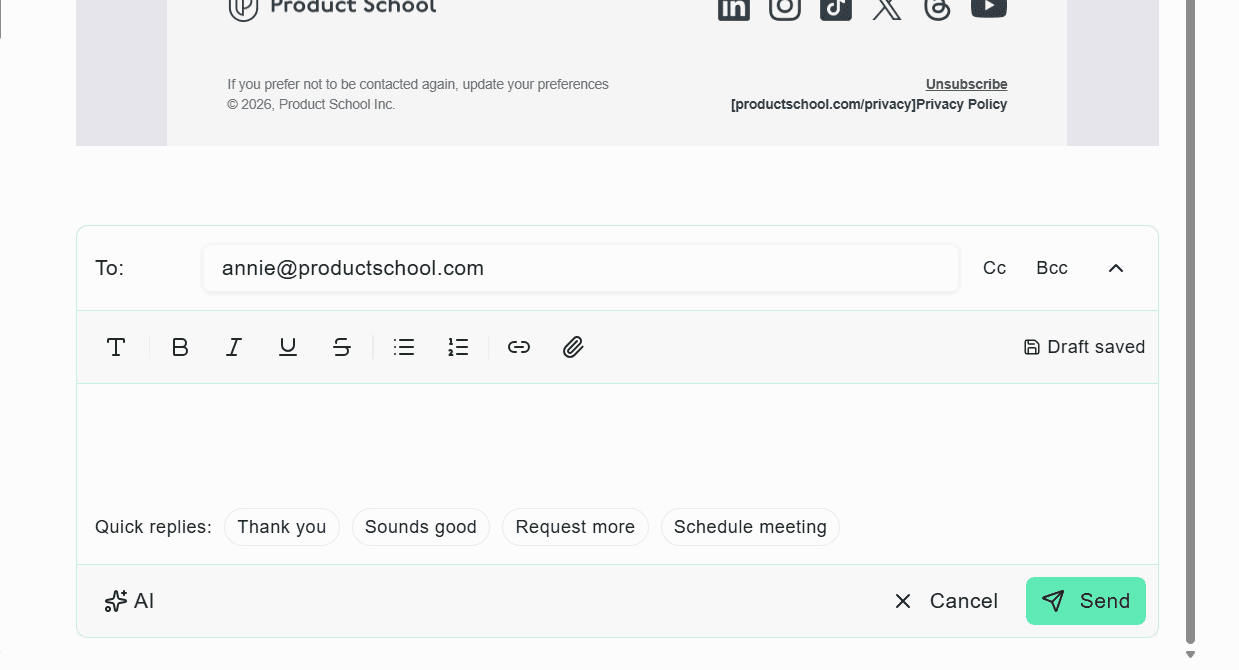 AI drafts replies in your voice. Edit or send.